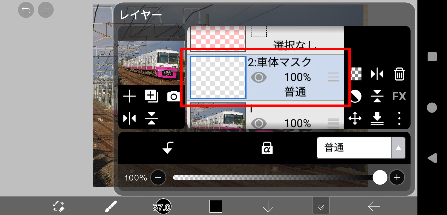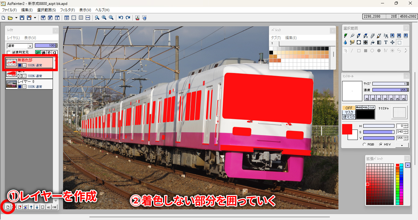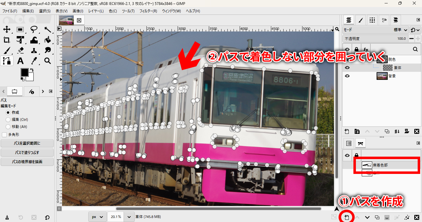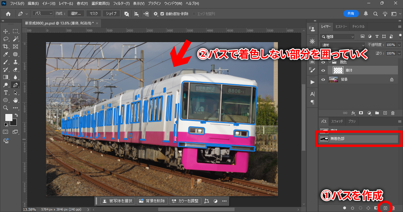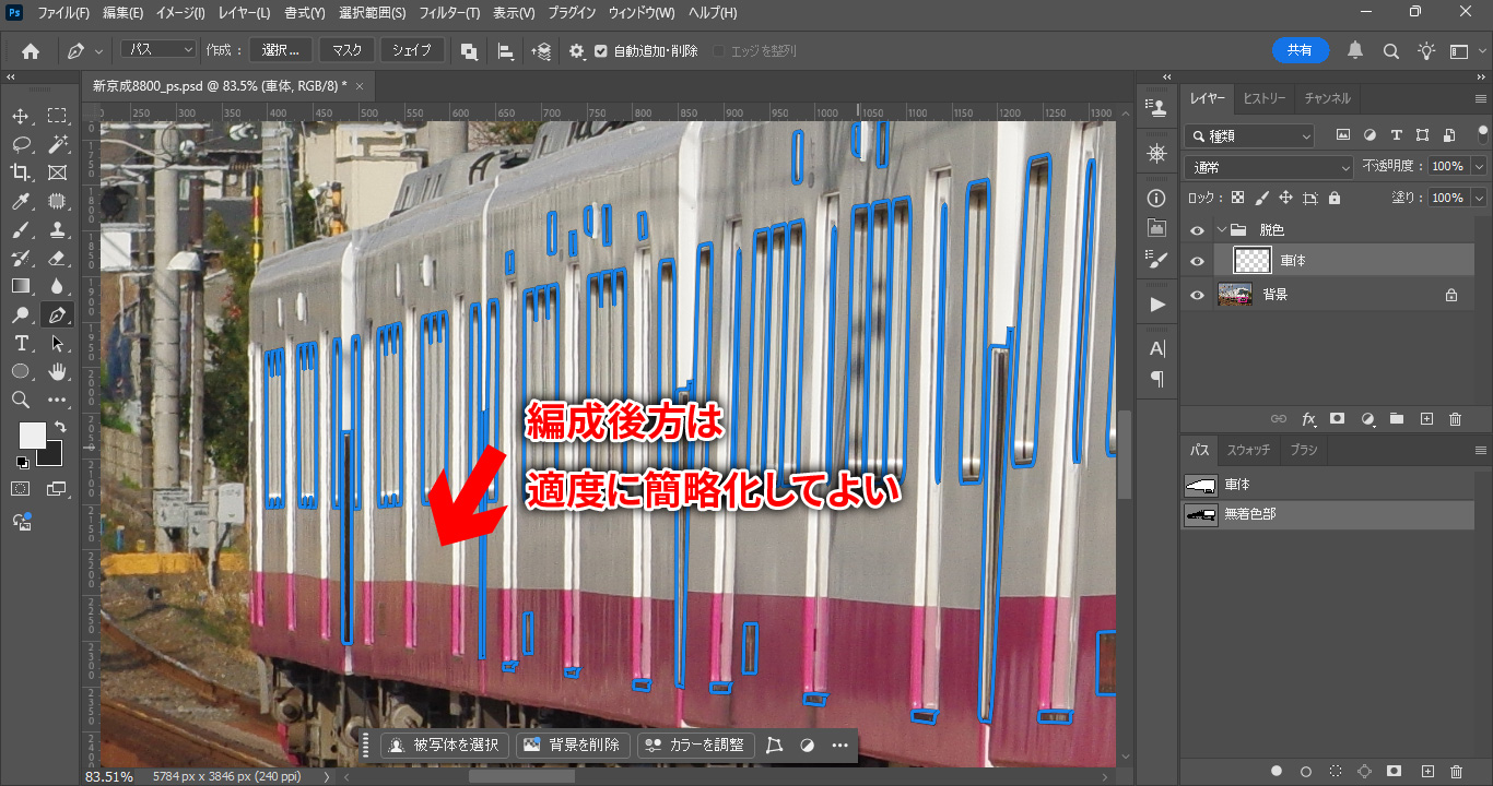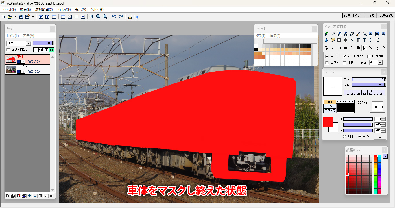 次に無着色部(車体のうち、窓や前照灯など着色を行わない部分)のマスクを作成します。
