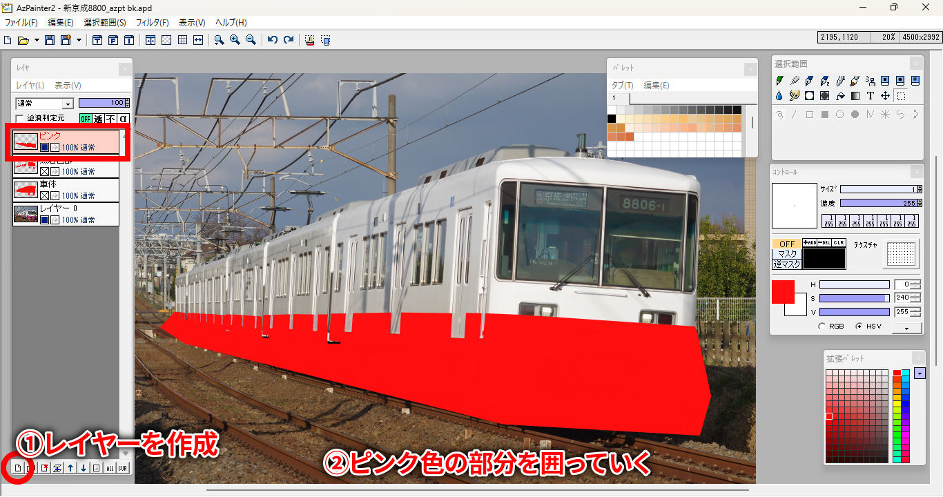 ピンク色で塗られている部分だけをマスクしていきます。白い部分は後述するピンク色マスク・車体マスクとの選択範囲の足し引きによってマスクすることができますので、ここではマスクを作りません。