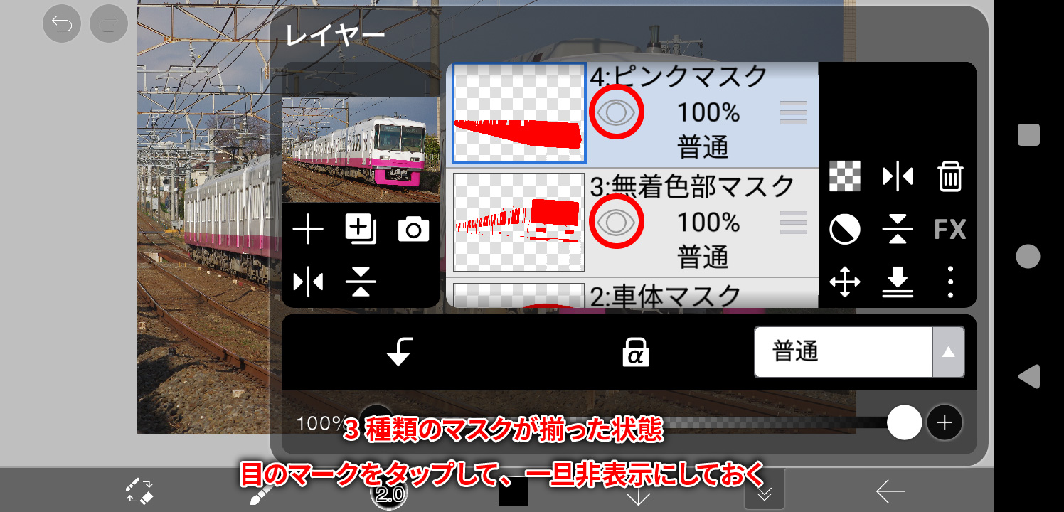初級編の時とは異なり、車体のマスク、無着色部(窓やドアなど、着色をしない部分)のマスク、デフォルトの塗り分けのマスクと、3種類のマスク画像を作る必要があります。