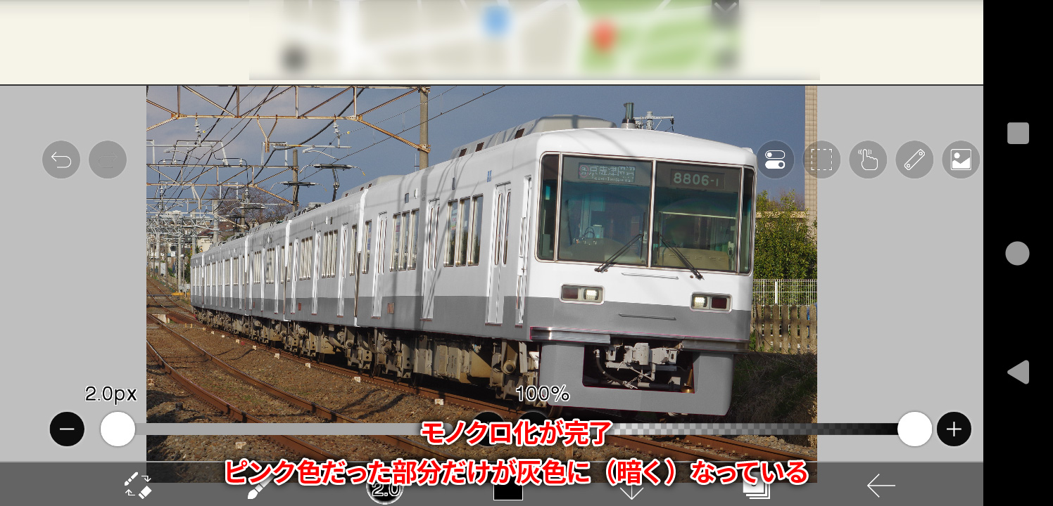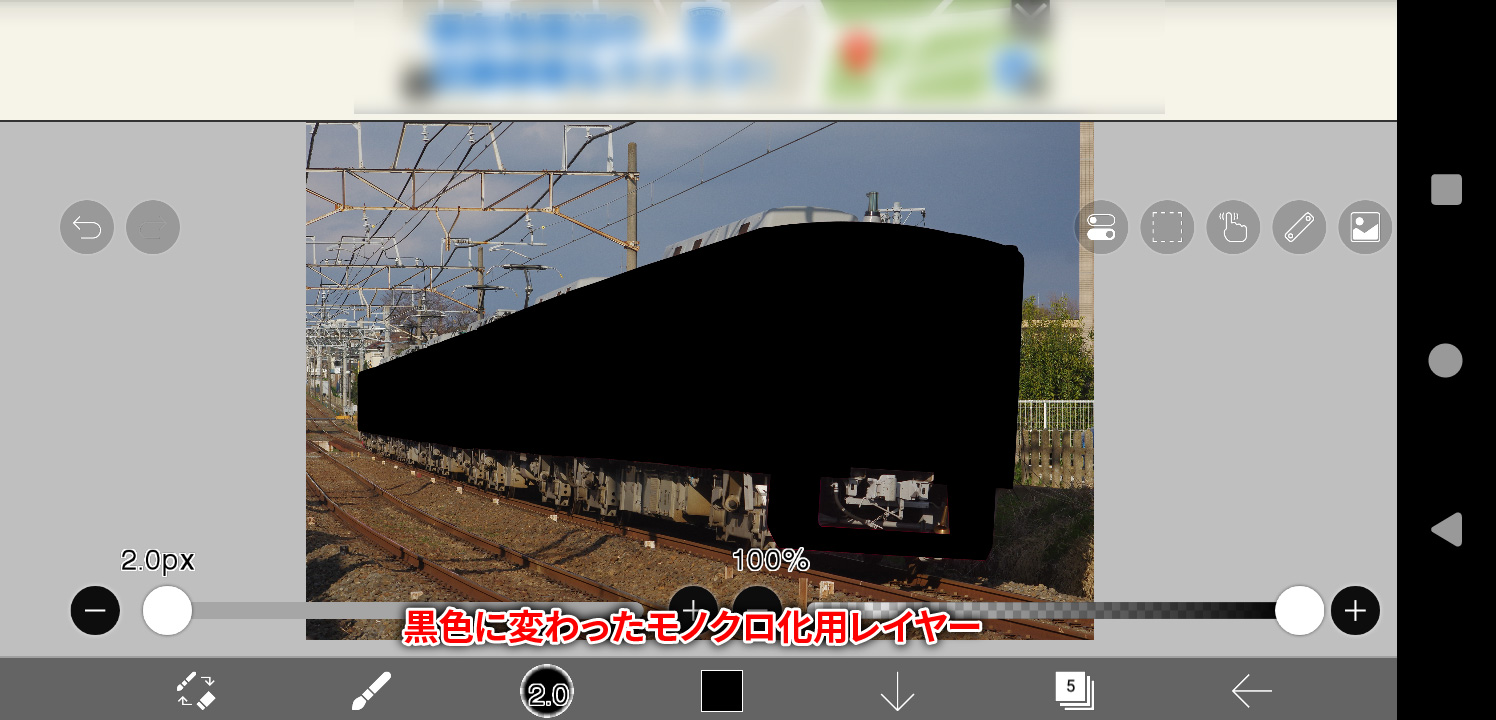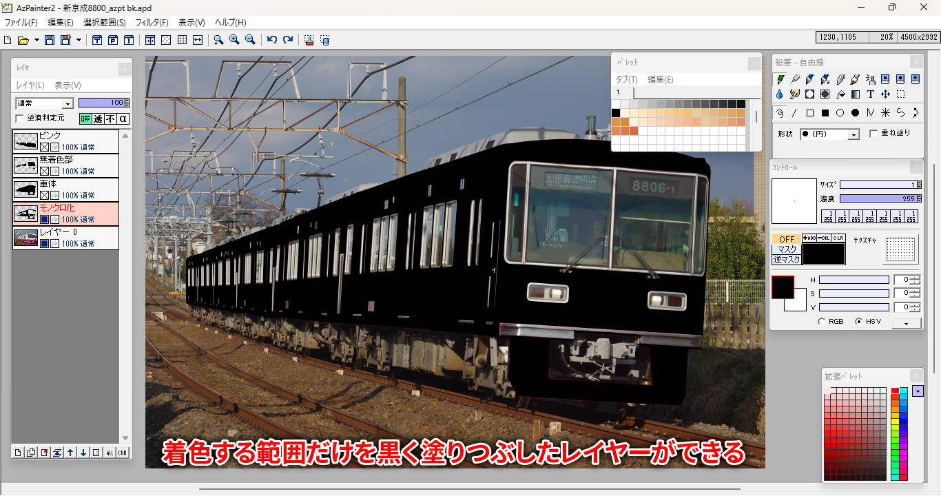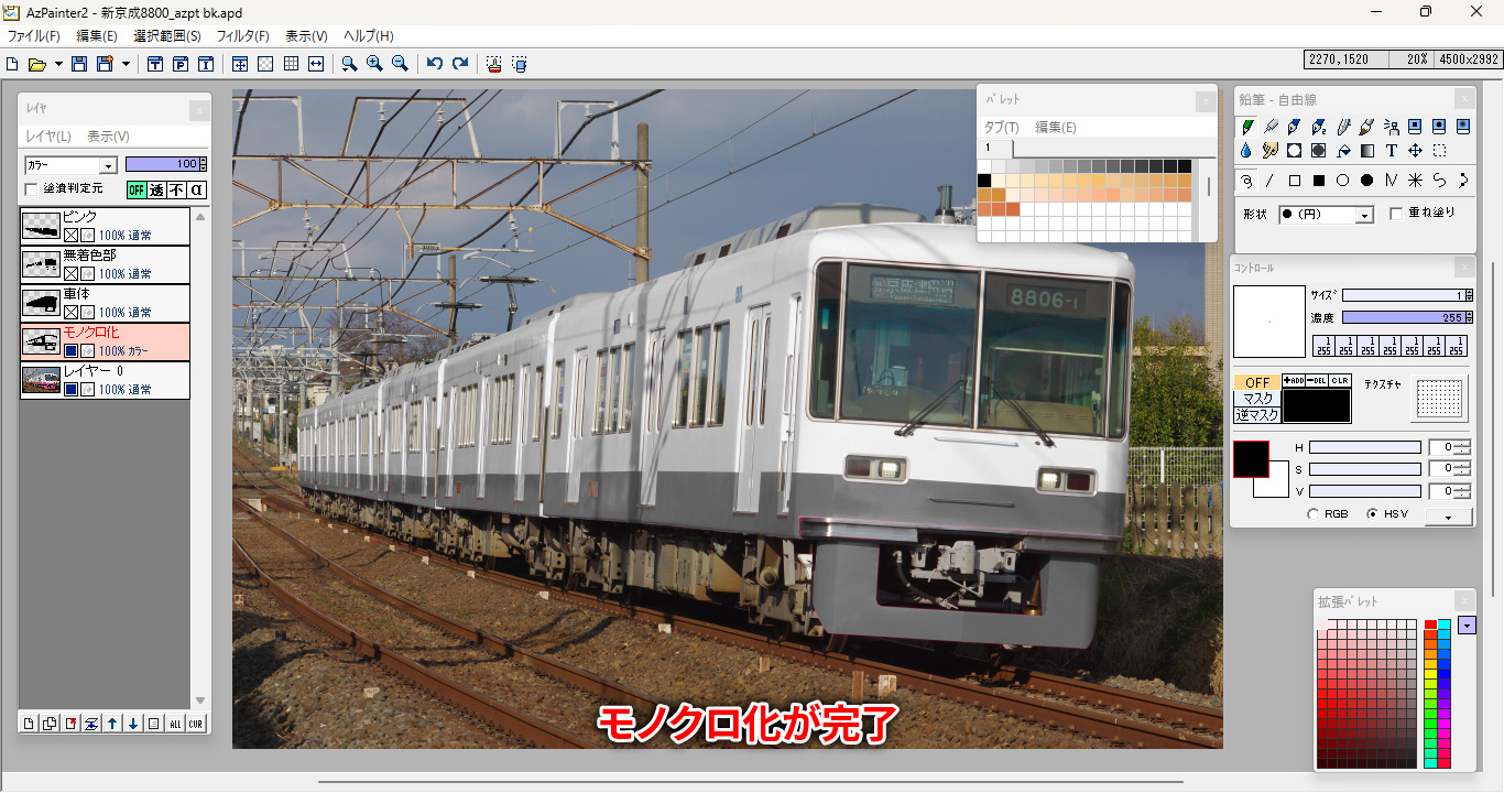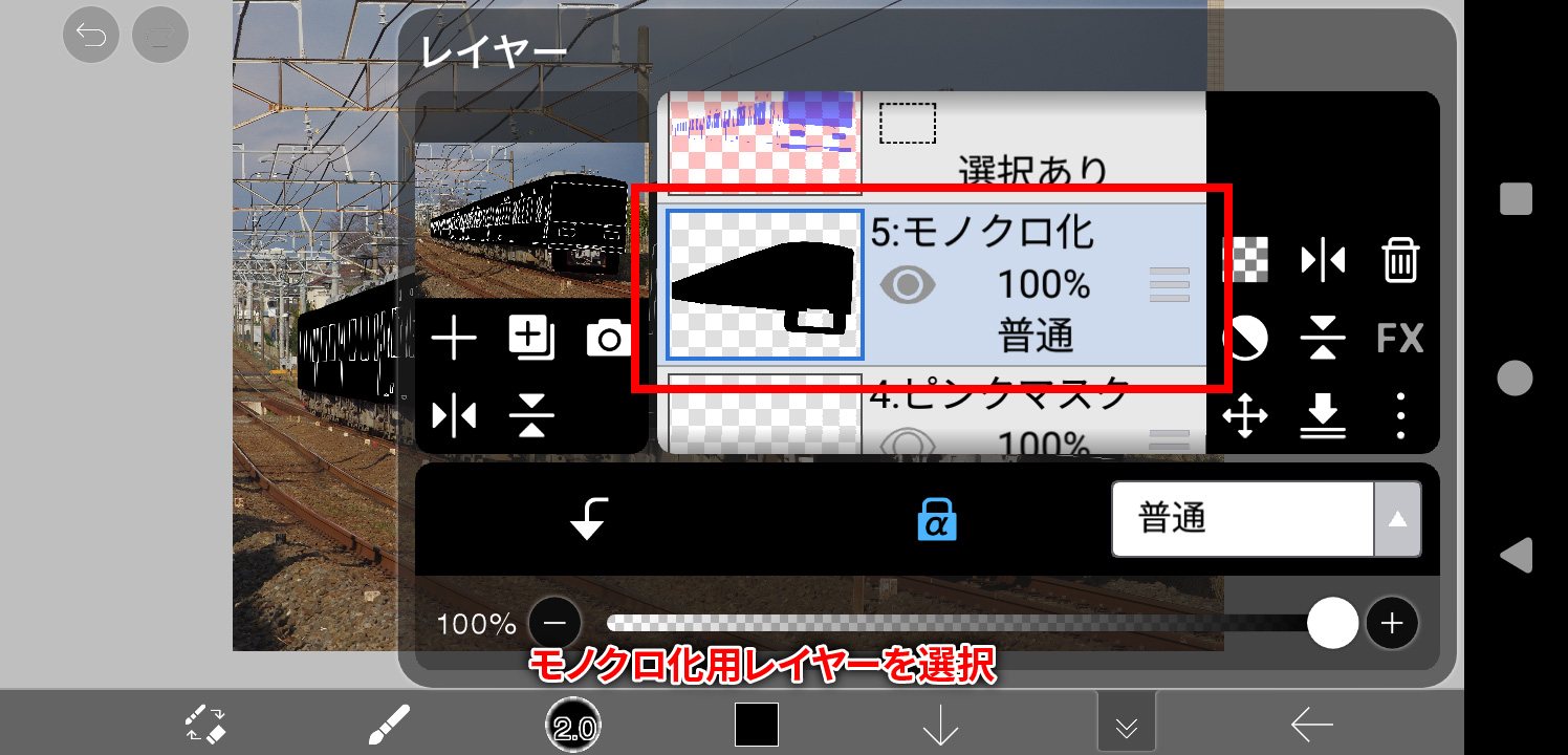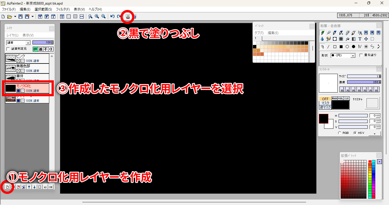 そうしますと、モノクロ化用レイヤーの赤い部分が黒一色に変わるはずです。