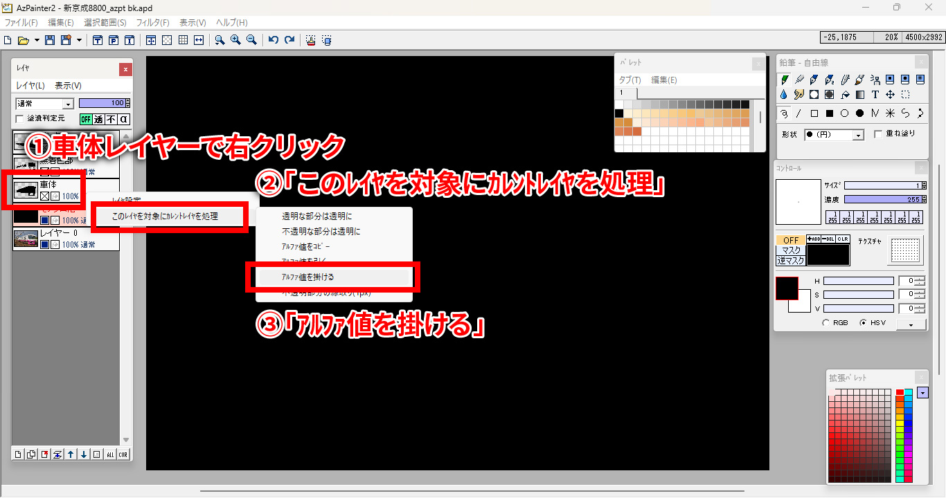 モノクロ化用レイヤーを選択した状態で、車体レイヤーの上で右クリックし、「このレイヤを対象にカレントレイヤを処理」から「アルファ値を掛ける」を選択します。