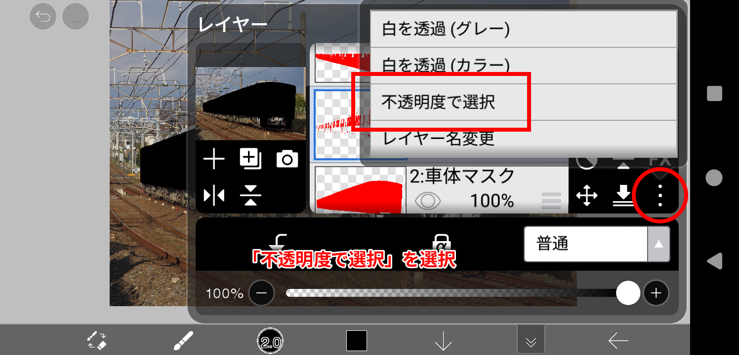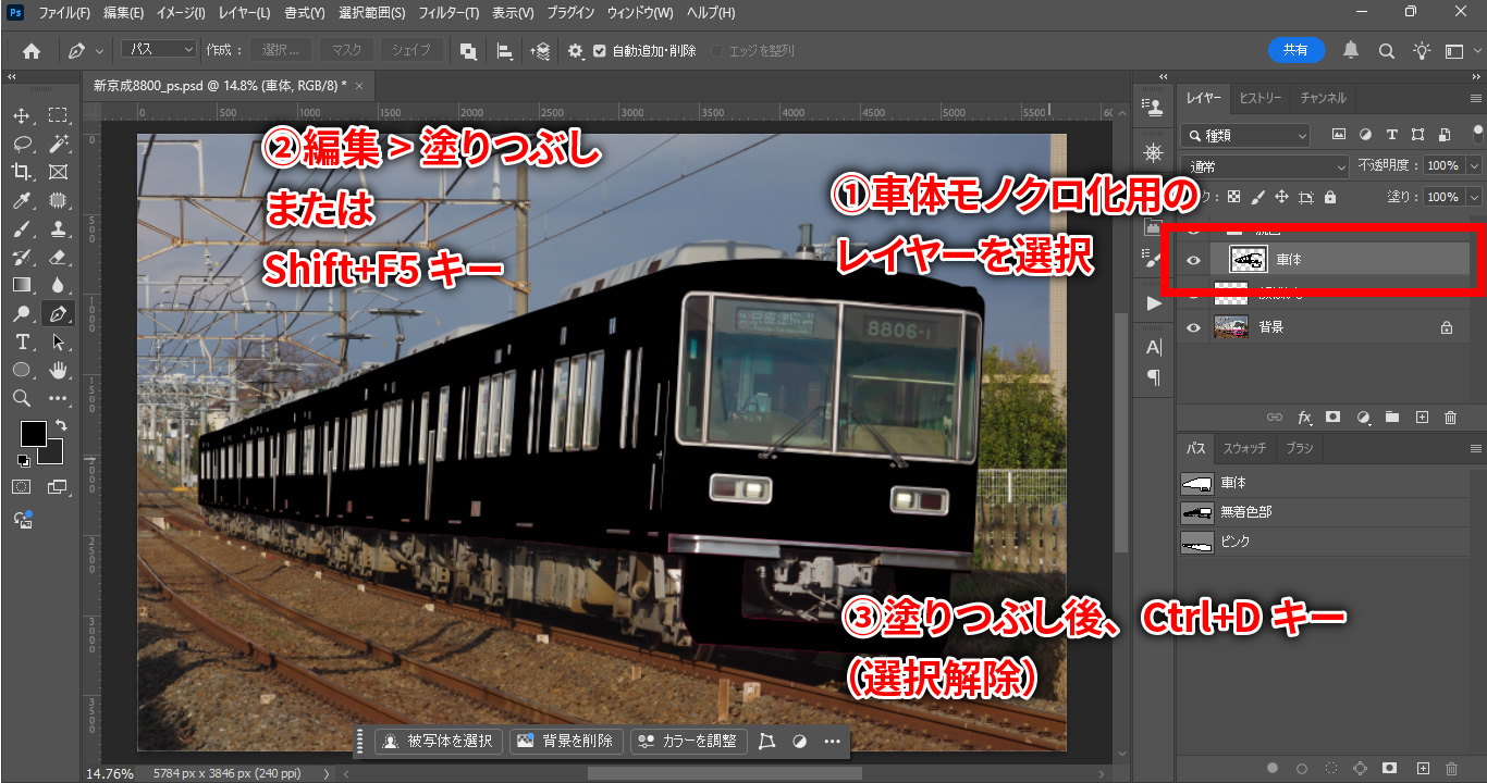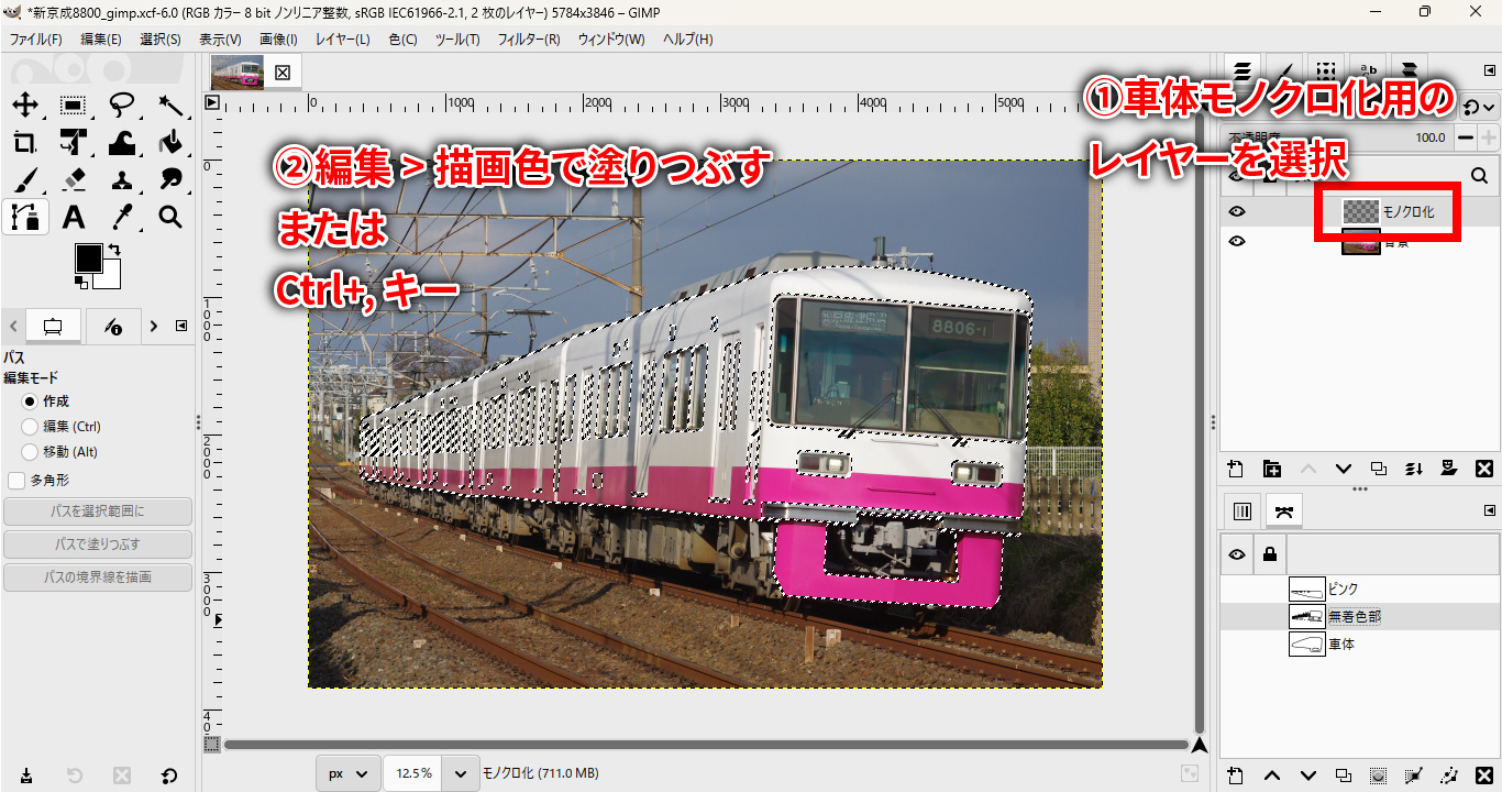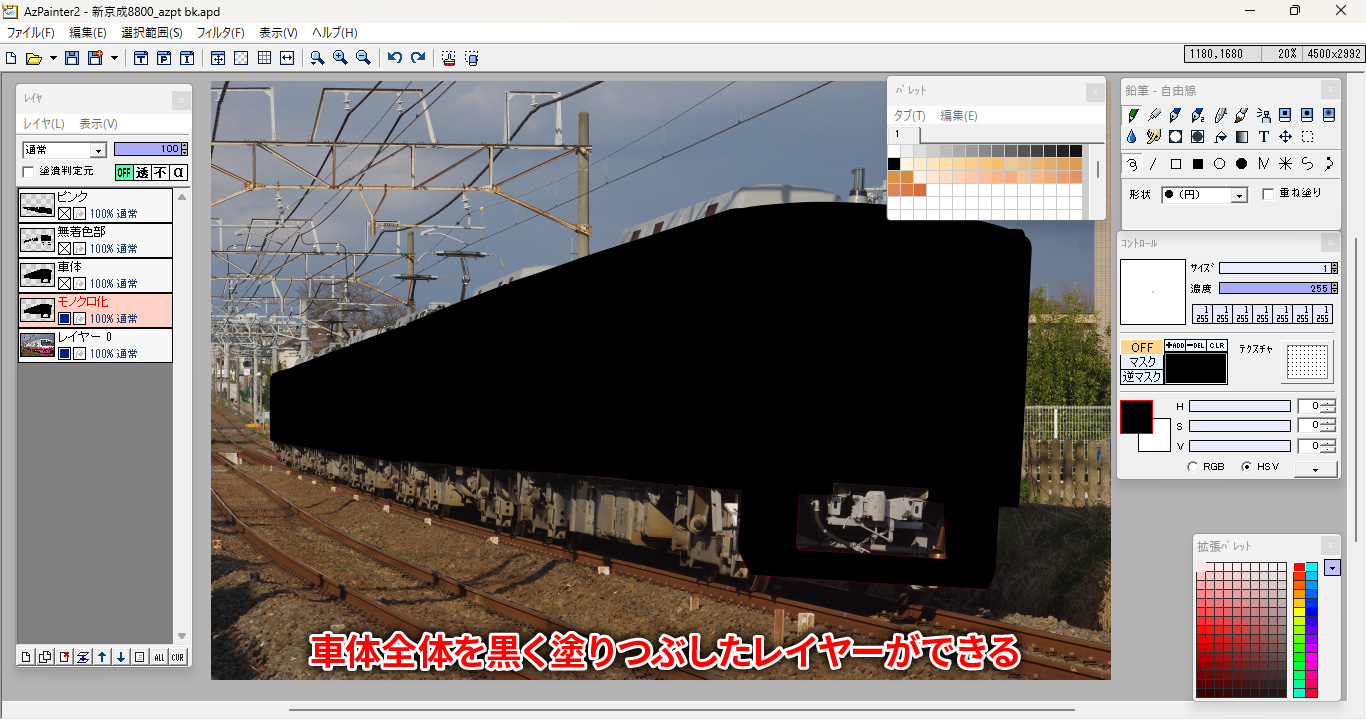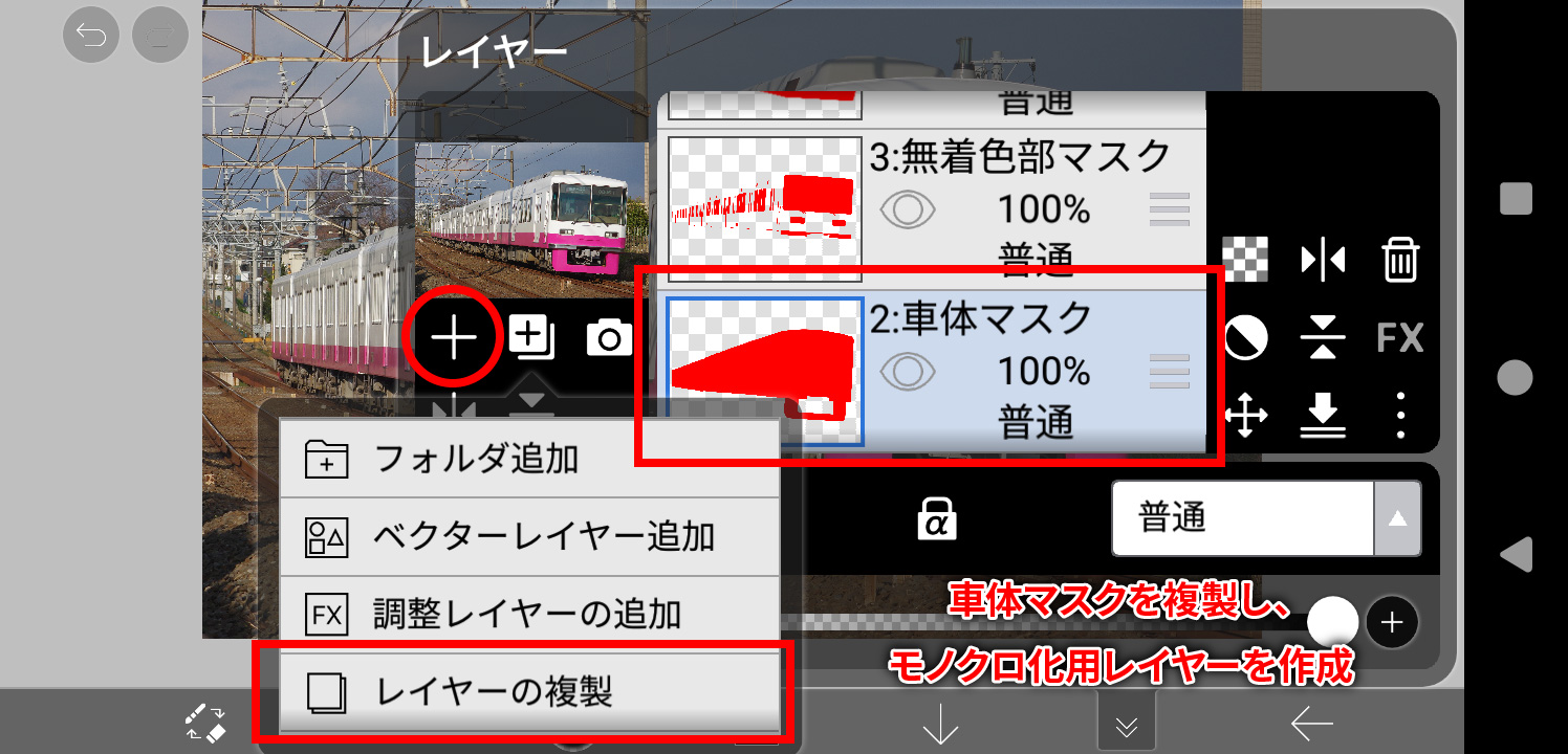 車体マスクレイヤーを複製し、モノクロ化用のレイヤーを作成します。