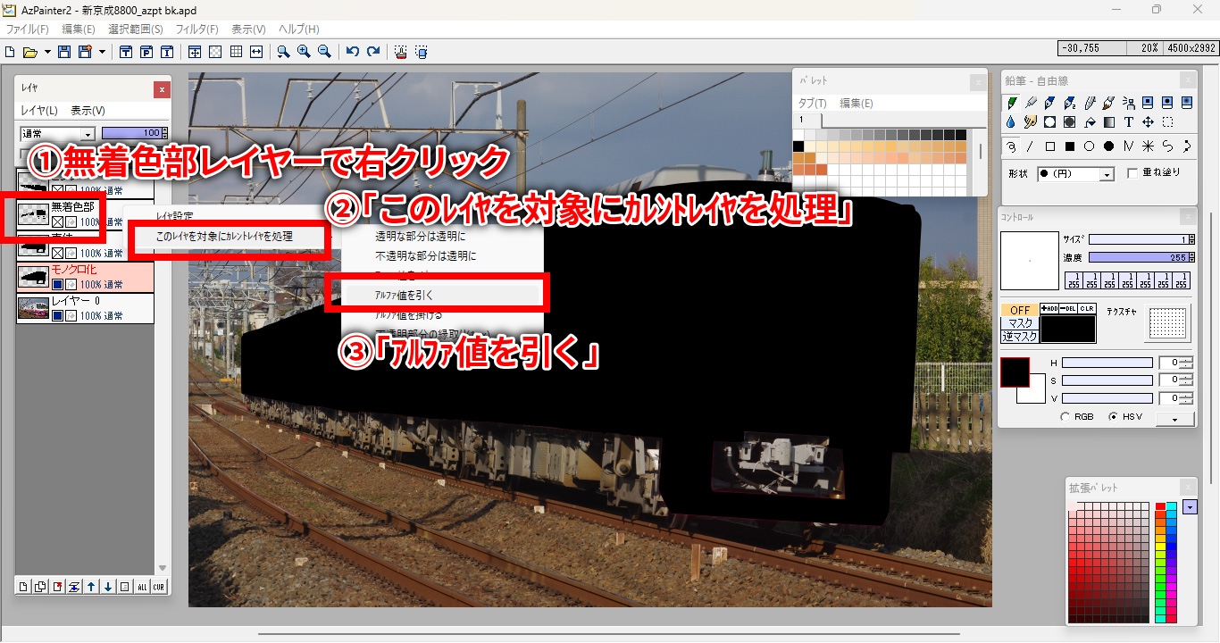続いて、同じくモノクロ化レイヤーを選択したまま、今度は無着色部レイヤーの上で右クリックし、「このレイヤを対象にカレントレイヤを処理」から「アルファ値を引く」を選択します。