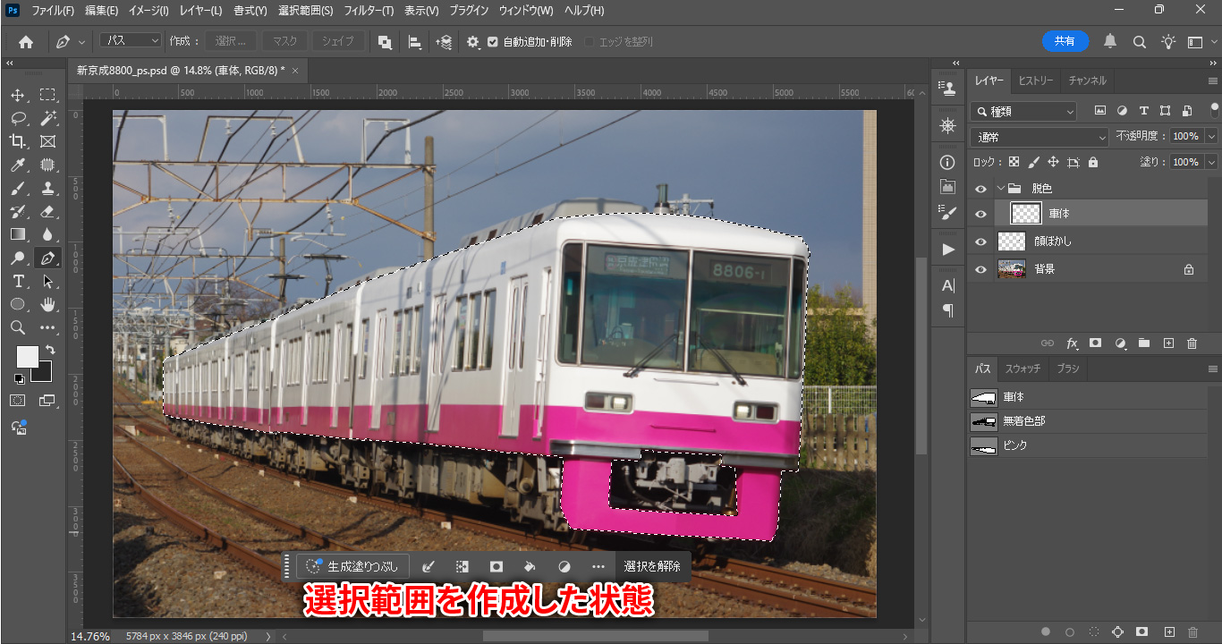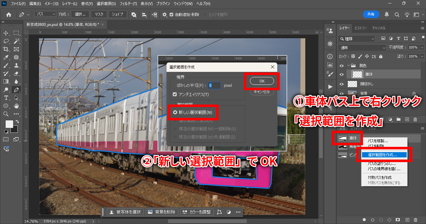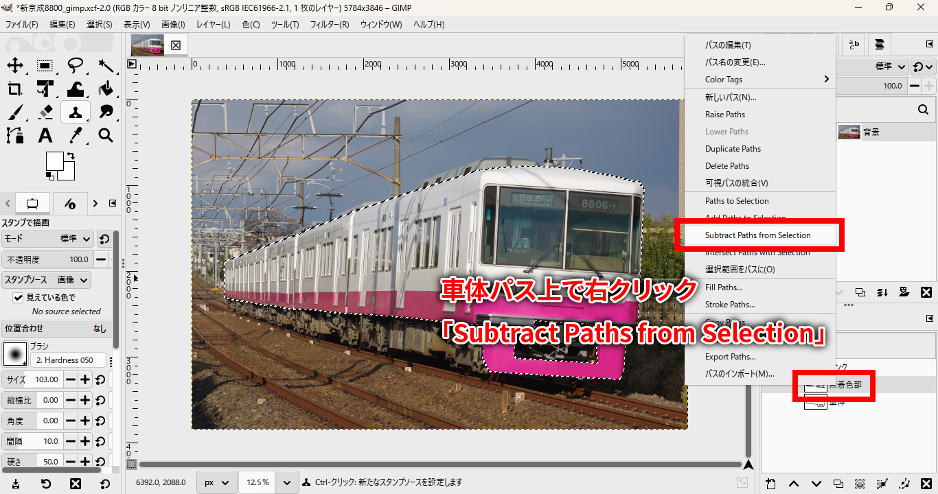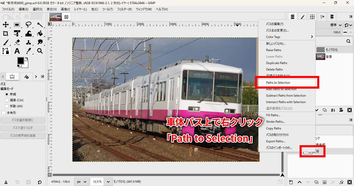 先ほど作成した車体マスクのパスを選択し、右クリックして「選択範囲を作成」を選び、OKを押します。「Paths to Selection」(パスを選択範囲にする)を選びます。