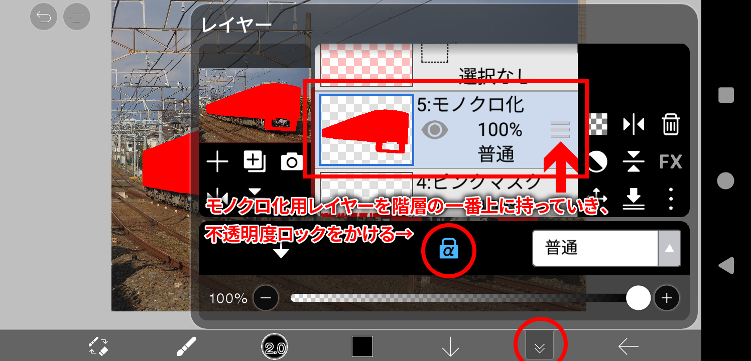 モノクロ化用レイヤーを階層の一番上に持っていき、不透明度ロックをかけます。