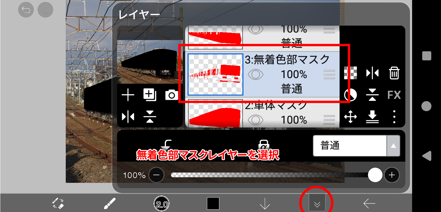 いわば型抜きです。茶色のクッキー生地に星形の型を当てれば茶色い星形のクッキーが作れるように、ここでは黒一色のレイヤーに車体の形の型(マスク)を当てて黒一色の車体形のレイヤーを作成します。