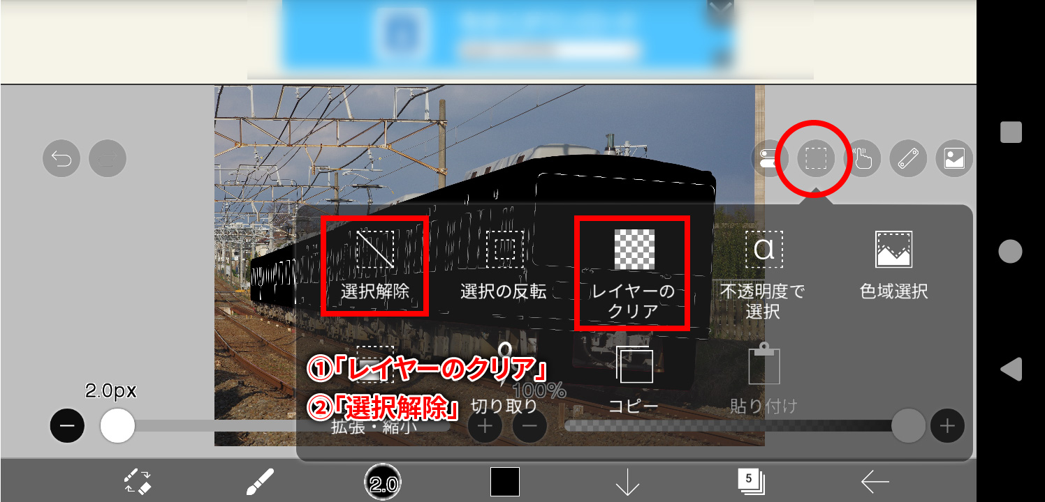 次にモノクロ化用のレイヤーを選択し、選択範囲メニューから「レイヤーのクリア」を実行します。