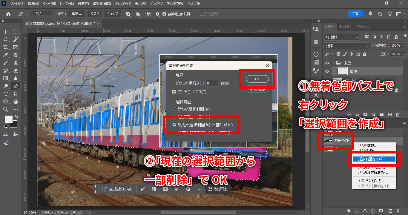 続いて、同じく無着色部パスで右クリックして「選択範囲を作成」を選び、今度は「現在の選択範囲を一部削除」を選択してOK「Subtract Paths from Selection」(選択範囲からパスを引く)を押します。